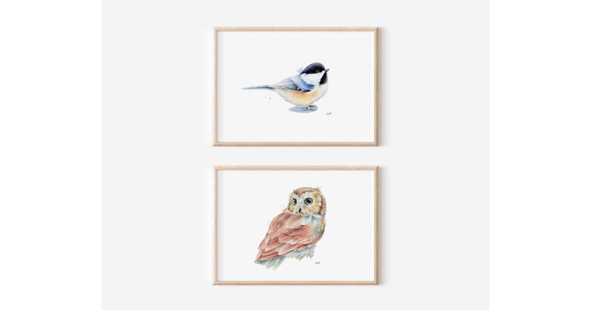 Saw-Whet and Chickadee Print Set - These delicate, nature-inspired pieces capture the quiet magic of woodland life and are perfect for cozy interiors, nursery walls, or thoughtful gifting. Each print is professionally produced on museum-quality, textured watercolor paper that beautifully replicates the look and feel of the original painting. I use archival, pigment-based inks to ensure vibrant, long-lasting color that won’t fade... More >