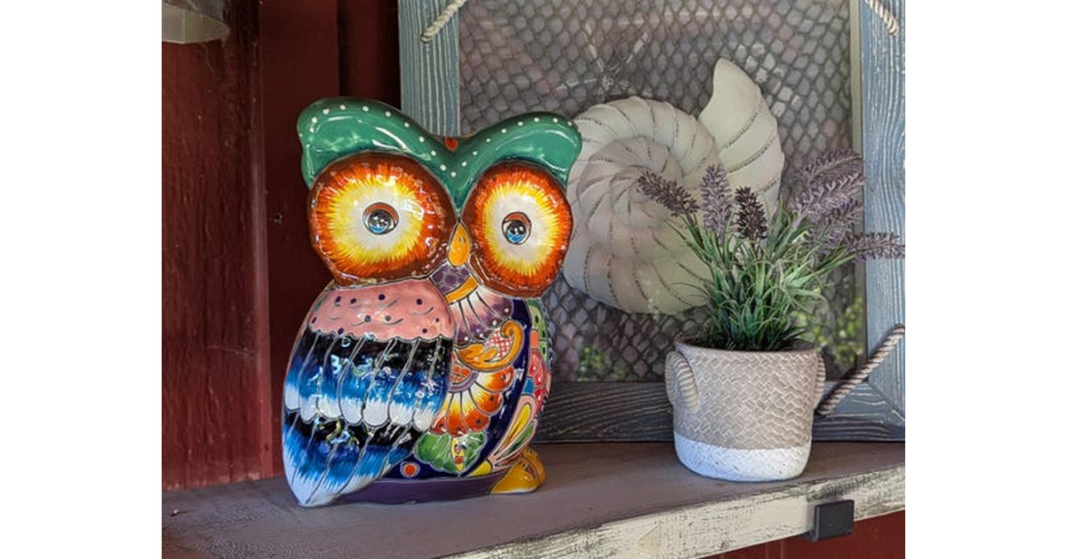 Ceramic Owl Planter is Colorful Talavera Pottery as an Indoor Flower Pot or Outdoor Owl Decor Mexican Planter & Plant Pot good for Home or Gareden Decor Makes a Great Owl Gift for Bird Lovers Introducing our new Talavera Owls, a captivating fusion of vibrant colors and intricate patterns. Handcrafted with meticulous attention to detail, this enchanting ceramic masterpiece showcases the traditional artistry of Talavera pottery, makin... More >