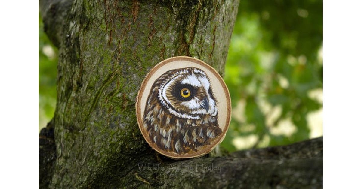 Here is one of my unique, original wildlife paintings, featuring a short eared owl, on a birch wood slice. Approximately: 7 cm x 6.5 cm in diameter (2.8 x 2.4 inches) A perfect one of a kind gift for any wildlife and nature lover, this painted wood slice is a wonderful way to own a piece of original art in a unique way. Signed, dated and stamped on the reverse. This painting is coated with a layer of protective matt varnish, this paint... More >