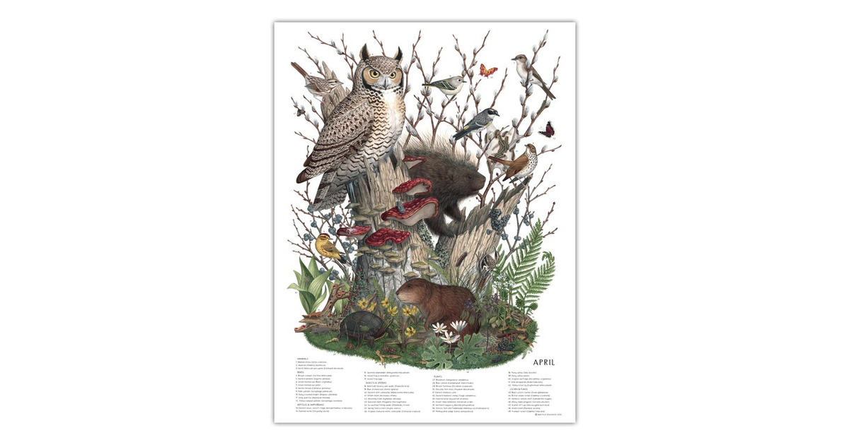 APRIL color print Welcome the arrival of spring with this richly detailed watercolor illustration, originally created for the book The Forest Revealed. This art print showcases the plants, animals, and fungi you might encounter in April throughout Northeastern North America. Featured in the scene are a great horned owl, porcupine, red eft, trout lily flowers, and pussy willows, all surrounding an eastern hemlock stump, along with dozens... More >