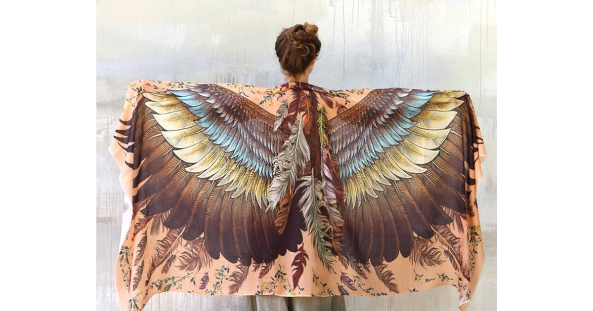 Bird Wing Shawl, Festival Clothing, Saffron Feather Wrap Shawl This unique bohemian wings and bird feathers scarf features: Delicately hand-painted and digitally printed Art of Wide-Spread Wings, this highly detailed representation of Nature, Freedom and Beauty is my Labor of Love. A beautiful array of colors that work together in fresh unison. What makes this scarf truly amazing is its versatility. It can be worn with both light and d... More >
