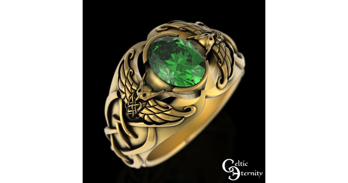 Want to engrave your ring? Purchase your custom message here: www.etsy.com/listing/1820974959 See this ring with more stones and metals: www.etsy.com/shop/CelticEternity?search_query=3057 Ring at its tallest point - 13.2mm; 6mm near back Stone: 8x6mm Emerald This stunning ring blends Viking mythology with Celtic knotwork, featuring two owls with outspread rings on either side of an Emerald gemstone. The owls symbolize wisdom, affection,... More >