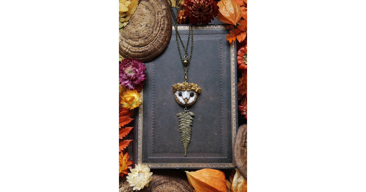 A forest-inspired pendant featuring a wise little owl crowned with golden leaves and a detailed fern charm. Each element is sculpted by hand from polymer clay and finished with metallic accents for a soft woodland glow. The pendant hangs on a double bronze chain — the inner one with a tiny acorn (52 cm) and the outer with the owl pendant (62 cm). Pendant size with fern: approx. 9 × 3.5 cm. This piece is perfect for anyone wh... More >