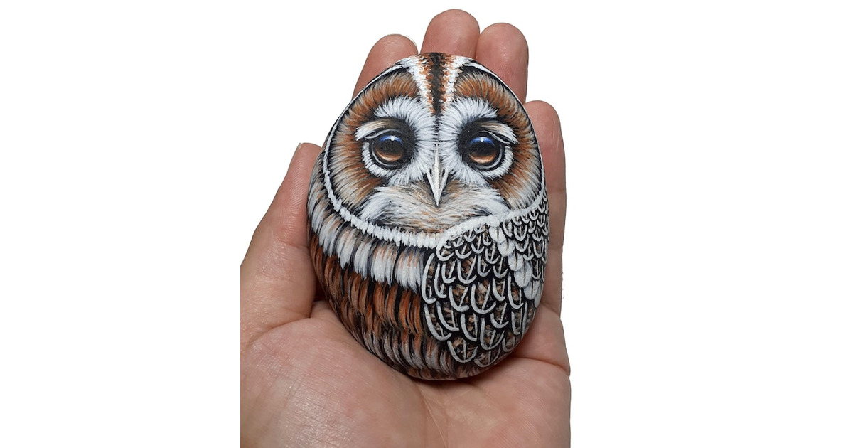 Bring a touch of wildlife art into your home with this miniature Tawny owl painted stone. Perfect as a decorative accent, a heartfelt gift for yor beloved ones, or a unique collectible for owl lovers. Using a natural sea stone, carefully selected from a Greek island. Hand-painted with fine art acrylic paints and detail brushes. Design: Tawny owl portrait painting. Signed on the back and sealed with protective varnish for durability.... More >