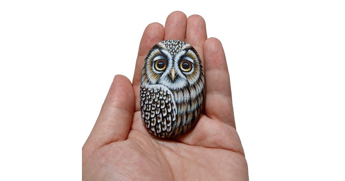 A miniature owl hand painted by me on a natural sea stone. Perfect for animal and owl lovers, nature enthusiasts, or anyone who appreciates unique, handmade decor. Whether displayed on a desk, shelf, or gifted to someone special, this charming painted stone will bring a touch of nature’s beauty into any space. Is painted on a smooth flat sea stone which i have collected from the Greek island of Ikaria. Is painted with fine art qua... More >