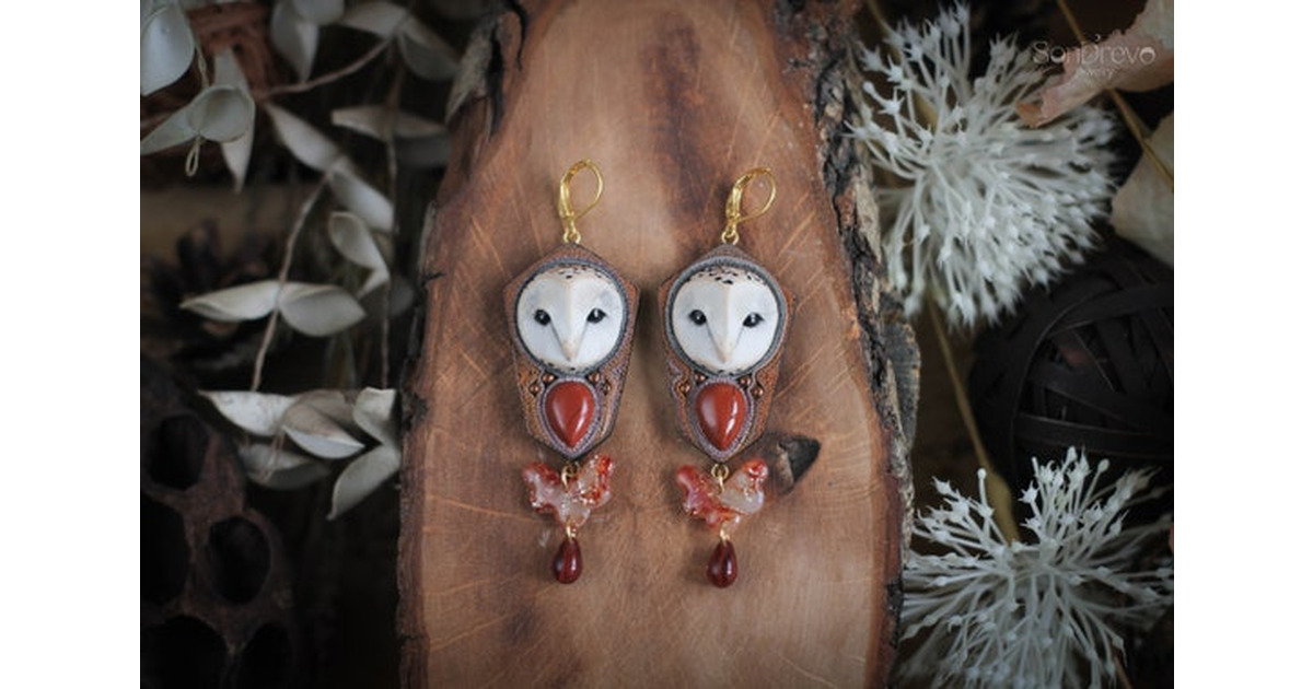 Information for US buyers: Delivered Duty Unpaid (DDU) is used. You will not have to pay duty upon receipt. Long earrings with light barn owls. Handmade of polymer clay. Complemented with glass beads and jasper cabochon. These unusual fancy earrings will be a good gift for lovers of bright jewelry, owls, and forest themes. The weight of each earring is about 8 grams (0.30oz). Materials: polymer clay, glass beads, agate, stainless stee... More >