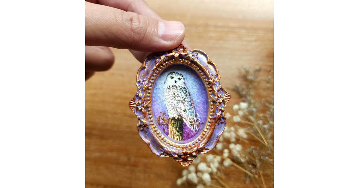 Bring a touch of quiet winter magic into your home with this tiny original watercolor of a snowy owl perched calmly under a violet twilight sky. I painted this piece to capture the feeling of stillness and gentle strength—like the moment when the world slows down and the owl watches everything with silent confidence. Its soft feathers, thoughtful gaze, and the cool-purple background create a calm, peaceful mood that invites you to... More >