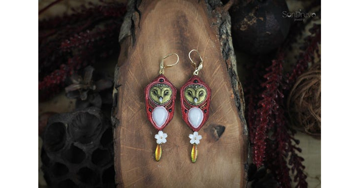 Information for US buyers: Delivered Duty Unpaid (DDU) is used. You will not have to pay duty upon receipt. Long earrings with barn owls. Handmade of polymer clay. Complemented with tinted quartz cabochon. These unusual fancy earrings will be a good gift for lovers of bright jewelry, owls, and forest themes. The weight of each earring is about 5 grams (0.20oz). Materials: polymer clay, tinted quartz, glass, acrylic beads, stainless st... More >