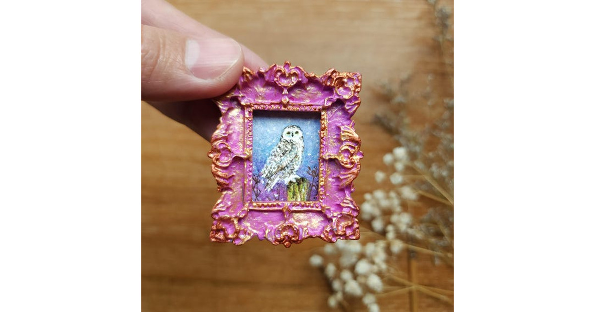 Bring a touch of quiet winter magic into your home with this tiny original watercolor of a snowy owl perched calmly under a violet twilight sky. I painted this piece to capture the feeling of stillness and gentle strength—like the moment when the world slows down and the owl watches everything with silent confidence. Its soft feathers, thoughtful gaze, and the cool-purple background create a calm, peaceful mood that invites you to... More >