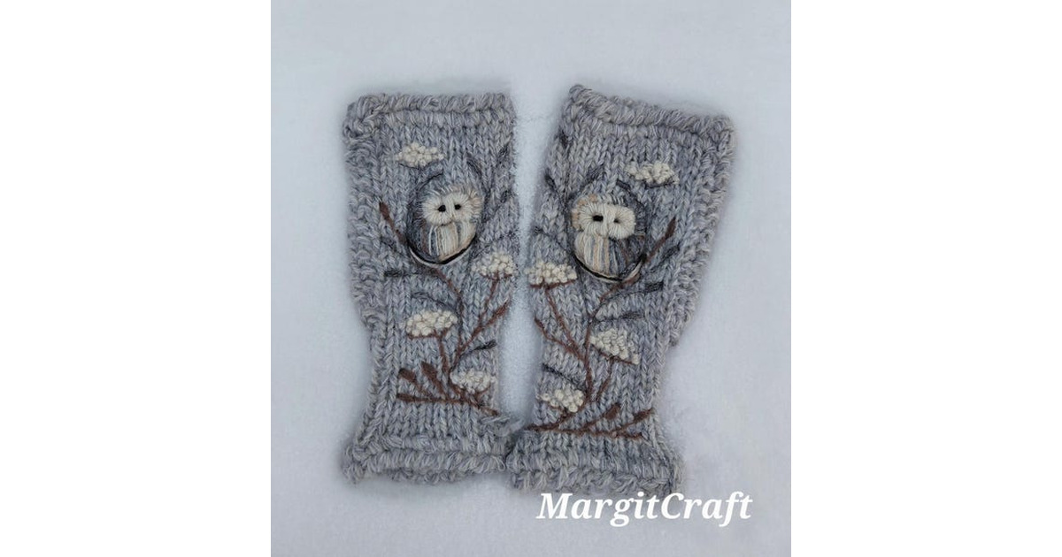 Hand knitted fingerless mittens with embroidery owl,winter accessories,casual and lovely Valentine's Day gift,gift for her,wool arm warmers. Size: Medium 18 cm/ 7,1 inches long Please note that colors and embroidery of the product may vary a little one moitor to another. More >
