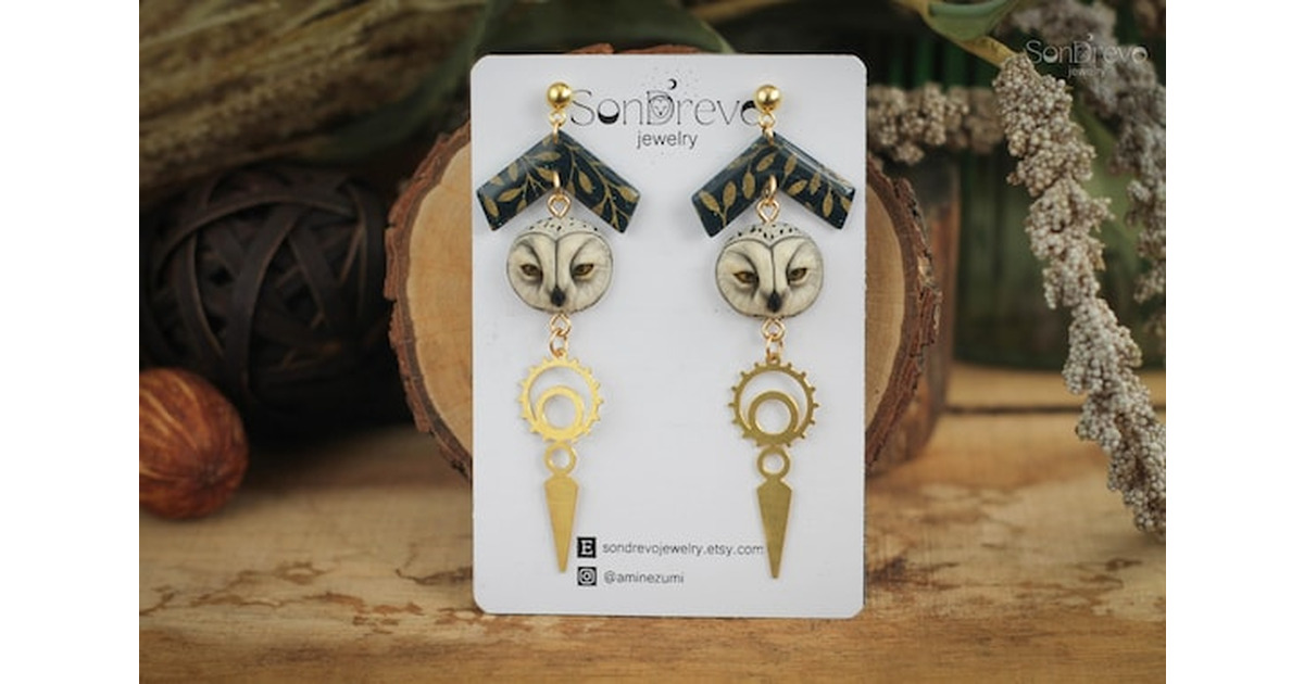 Information for US buyers: Delivered Duty Unpaid (DDU) is used. You will not have to pay duty upon receipt. Long earrings with white owls. Handmade of polymer clay. These unusual fancy earrings will be a good gift for lovers of bright jewelry, owls, and forest themes. Materials: Materials: polymer clay, stainless steel, brass (arrow element). Size: 9 * 3 cm (3.4*1.1 inch) with closure. The weight is about 4 grams (0.10oz). Other ani... More >