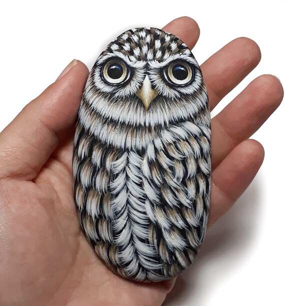 Cute miniature Borrowing owl full body portrait on a sea stone. Original acrylic painting on stone made by me, perfect for animal lovers, nature enthusiasts, or anyone who appreciates unique, handmade decor. Whether displayed on a desk, shelf, or gifted to someone special, this charming owl will bring a touch of nature’s beauty into your home! - Is painted on a natural sea stone hand-collected from rocky shores on a Greek island.... More >
