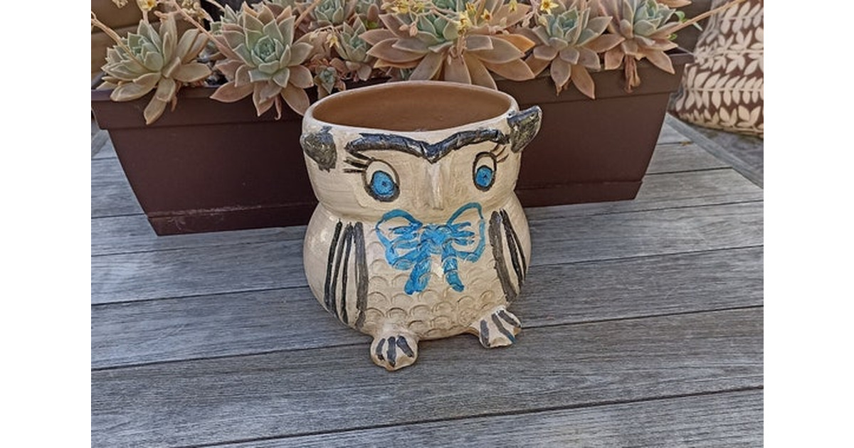 Blue Bow Tie Owl Planter, Flower Pot, Handmade Terra Cotta Mexican Pottery from Atzompa, Mexico, Home Decor, Indoor or Outdoor Decor, Charming Plant Pot > Measures 7.5" Tall by 7" diameter; 5.5" top opening; Weighs approximately 3 lbs 1 oz > This Planter is so alluring in its attractive charm and whimsical owl design > Great for highlighting your plants as Yard Decor, Outdoor Decor, Porch Decor or Home Decor &g... More >