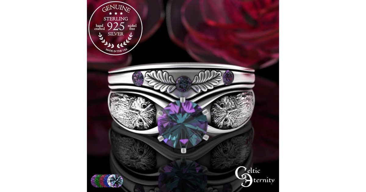 See all of our owl designs including matching sets: www.etsy.com/shop/CelticEternity?search_query=owl Solitaire Height: 6.1mm near the stone, 2.9 at back band Stone: 1x 6.5mm Alexandrite (1 carat) (or gem from menu) Accent Height: 5.6mm at front, 2mm at back Stones: 3 x 2mm Alexandrite (or gem from menu) This 1 carat engagement ring features a set of owls, gracing a sparkling center stone. Across many cultures, owls symbolize wisdom and... More >