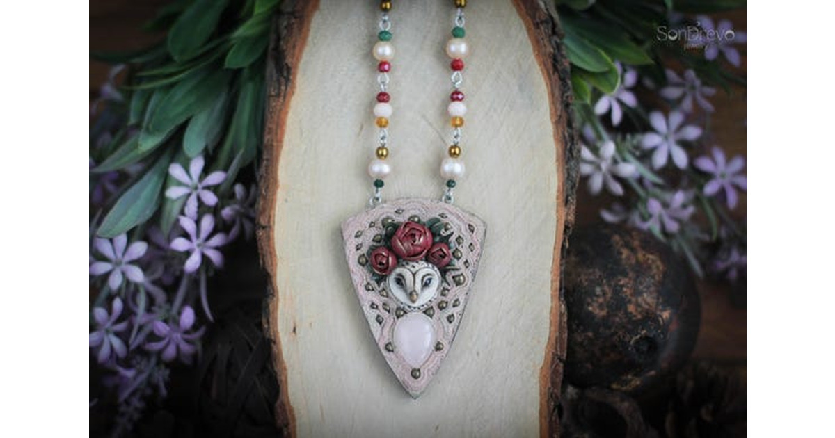 Information for US buyers: Delivered Duty Unpaid (DDU) is used. You will not have to pay duty upon receipt. Barn owl necklace. Made of polymer clay, supplemented with rose quartz, pearl, and glass beads. This necklace will be an excellent gift for the lover of owls and unusual jewelry. Materials: polymer clay, rose quartz, pearl, glass beads, stainless steel. The size: 6*4.5 cm (2.4*1.7 inch), length - 48 cm (19 inch). This pendant in a... More >