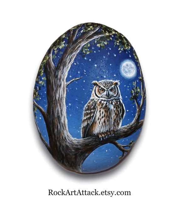 Hand painted on stone Eurasian Eagle Owl sitting on a tree branch under the moonlight in the night. Original acrylic painting which can be a clever gift idea for your loved ones or to decorated in any place on your home. Is painted on a natural sea stone which i have collectd from a Greek island. Is painted with fine art quality acrylic colors and very small brushes for the detail, is signed on the back and covert with satin varnish for... More >