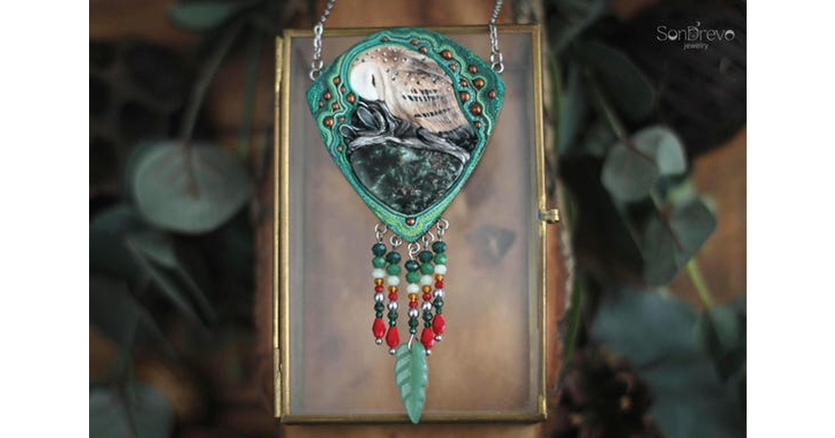 Information for US buyers: Delivered Duty Unpaid (DDU) is used. You will not have to pay duty upon receipt. Barn owl necklace. Made of polymer clay, supplemented with seraphinite and glass beads. This necklace will be an excellent gift for the lover of owls and unusual jewelry. Materials: polymer clay, seraphinite, glass beads, stainless steel. The size: 11.5*6 cm (4.5*2.3 inch) (with beads), length - 46 cm (18 inch). This pendant in a ... More >