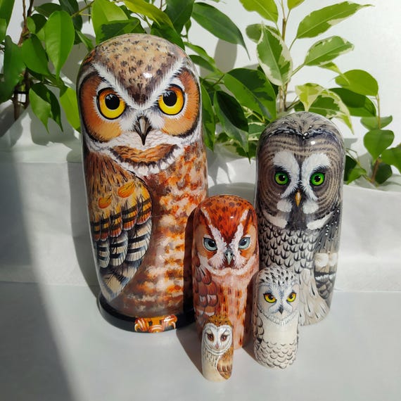 Owls are considered a symbol of wealth, prosperity, wisdom, good luck, and fortune. Signed by the artist on the bottom of the first doll. Set of 5 Hand Painted Owl Nesting Dolls. As with all children's products, adult supervision is required. Products that contain small parts may pose a choking hazard and should not be used by children under 3. More >