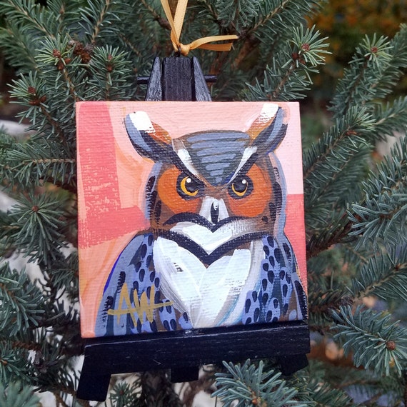 Each Bird mini painting is a one-of-a-kind work of art. I often paint more than one, using the same drawing and palette, but each has different brushstrokes and will be unique I paint each bird with acrylic gouache on a mini-canvas and mount it with removable glue dots on a painted easel. I attach a tiny screw eye and ribbon so this can be hung on a tree or in a window with ease. -Or, remove the ribbon and screw eye and set on a shelf o... More >