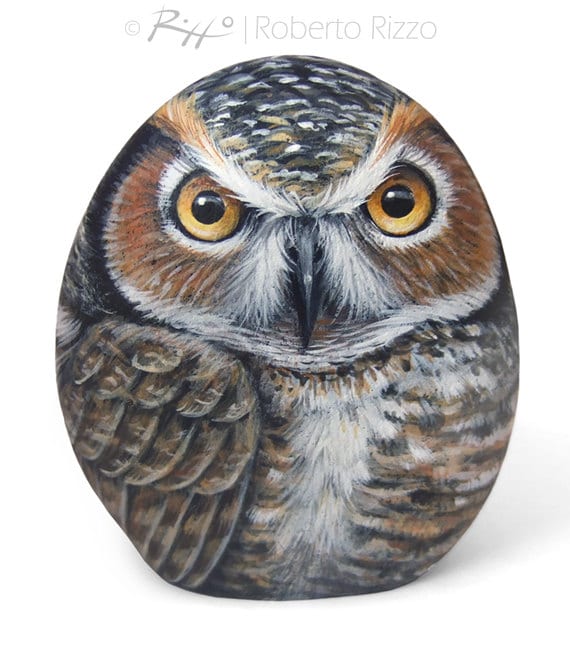 Hand Painted Rock Owl! A unique Piece of Art and a great Gift Idea for all of you, owl lovers! My painted stones are unique pieces of art. I paint all of them on BOTH SIDES of smooth sea rocks with high quality acrylics and very small brushes, FINELY DETAILED, protected with a strong transparent mat varnish coat, signed on the back and accompanied by a CERTIFICATE OF AUTENTICITY. * Measurements of this hand painted owl: Height 12 cm (4,... More >