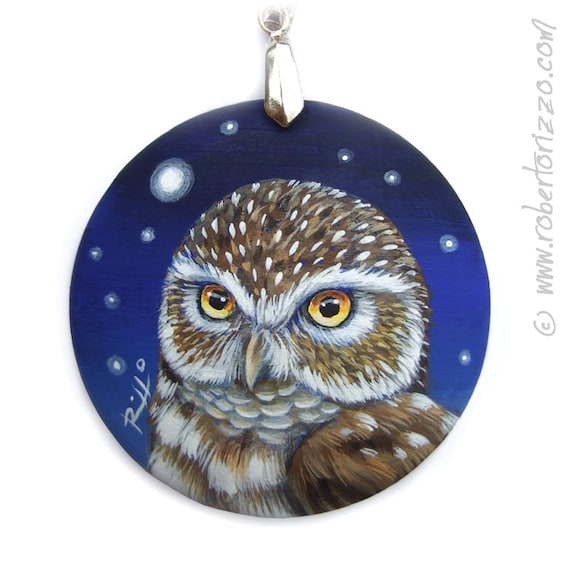 This Hand Painted Art Necklace Features a Pretty Little Owl's Close Up! The Nightly Background Adds a Touch of Magic to the Scene! Original Fine Detailed Jewels 100% Handmade by Roberto Rizzo. My hand painted wooden pendants are unique pieces of wearable art. I create each piece using acrylic paint, tiny paintbrushes and a whole lot of patience and care. All designs are created with my imagination, I love making items that are preci... More >