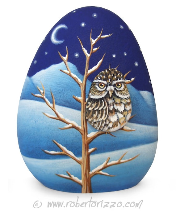 Hand Painted 3-D Little Owl Rock in Winter Made by Bonding Two Painted Stones Together! A Unique Piece of Art and a great Gift Idea for all of you, owl lovers! A painted pebble owl applied with a super glue on a larger one decorated with a winter landscape for a fantastic 3-D effect! My painted stones are unique pieces of art. I paint all of them with high quality acrylics and very small brushes. They are painted on smooth sea rocks, FI... More >