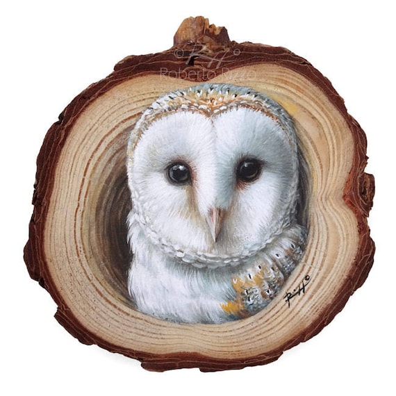 An Incredibly Detailed Barn Owl Coming Out from Its Lair, a Unique Wood Slice Painting by Roberto Rizzo! Original Art 100% Hand Painted! A fantastic trompe l'oeil to decorate your home and a unique gift idea for all of you, Owl lovers! This is a unique piece of art. It's meticulously painted on a natural, rough wood slice with high quality acrylics and protected with a satin varnish coat. This piece is signed, ready to hang... More >