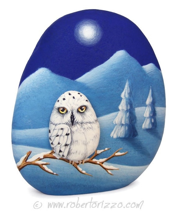 Hand Painted 3-D Snowy Owl Rock in Winter Made by Bonding Two Painted Stones Together! A Unique Piece of Art and a great Gift Idea for all of you, owl lovers! A painted pebble snowy owl applied with a super glue on a larger one decorated with a winter landscape for a fantastic 3-D effect! My painted stones are unique pieces of art. I paint all of them with high quality acrylics and very small brushes. They are painted on smooth sea rock... More >
