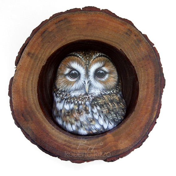 A Handpainted Tawny Owl in His Wooden Nest, a Unique Handmade 3-D Artwork by Roberto Rizzo! This is a unique piece of art! I realized it assembling a handpainted tawny owl made in clay in a hollow wooden trunk section with a power glue. The artwork is painted with high quality acrylics and very small brushes and protected with a satin varnish coat. This piece is also signed on the back, ready to hang and accompanied by a Certificate of ... More >