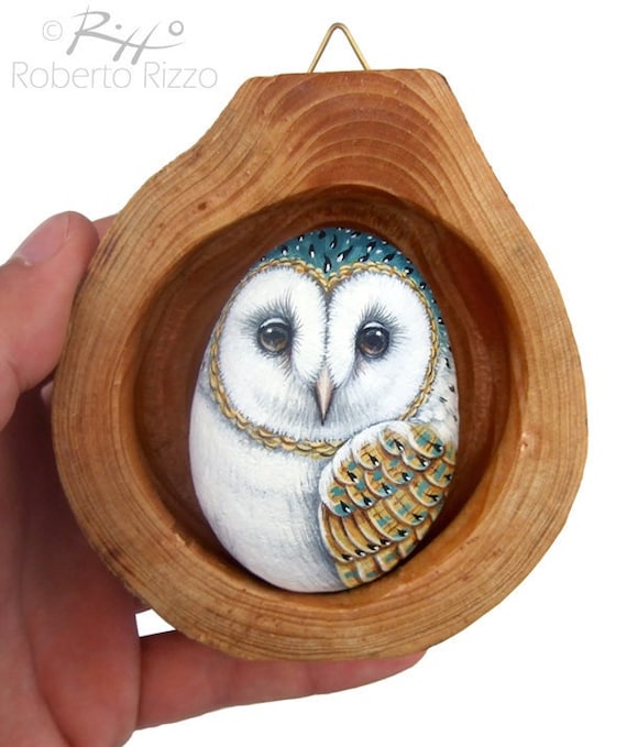 A Painted Rock Barn Owl in His Wooden Nest, a Unique Handmade 3-D Artwork by Roberto Rizzo! This is a unique piece of art! Ready to hang, I realized it assembling a painted rock barn owl in a hollow wooden trunk section with a power glue. The stone is painted with high quality acrylics and very small brushes and protected with a satin varnish coat. This piece is also signed on the back and accompanied by a Certificate of Authenticity. *... More >