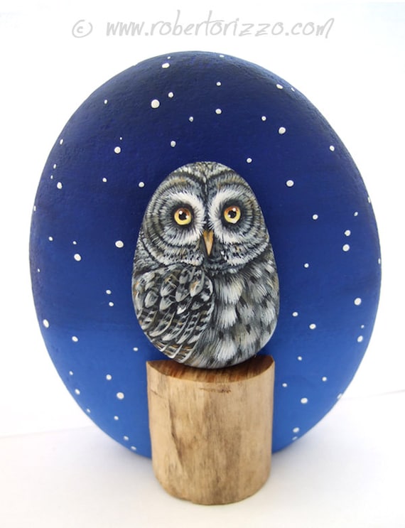 Hand Painted Great Grey Owl Rock! A Unique Piece of Art and a great Gift Idea for all of you, owl lovers! A pebble owl and a trunk section applied with a super glue on a larger one decorated with a snowy winter sky! My painted stones are unique pieces of art. I paint all of them with high quality acrylics and very small brushes. They are FINELY DETAILED, protected with a strong transparent varnish coat, signed on the back and accompanie... More >