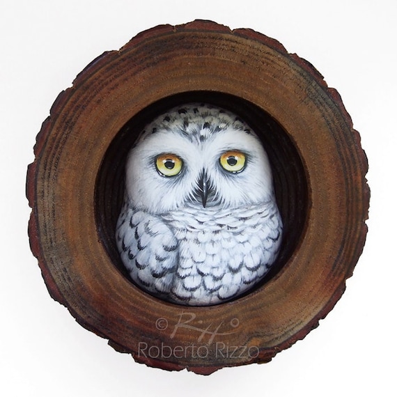 A Painted Snowy Owl in His Wooden Nest, a Unique Handmade 3-D Artwork by Roberto Rizzo! This is a unique piece of art! I realized it assembling a handpainted snowy owl made in clay in a hollow wooden trunk section with a power glue. The artwork is painted with high quality acrylics and very small brushes and protected with a satin varnish coat. This piece is also signed on the back, ready to hang and accompanied by a Certificate of Auth... More >