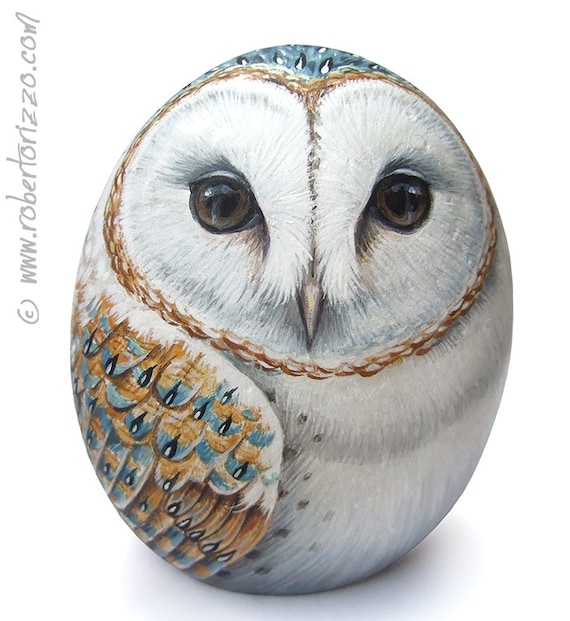 Hand Painted Barn Owl on a Rock! A unique Piece of Art and a great Gift Idea for all of you, owl lovers! My painted stones are unique pieces of art. I paint all of them with high quality acrylics and very small brushes. They are painted on smooth sea rocks, FINELY DETAILED, protected with a strong transparent varnish coat, signed on the back and accompanied by a CERTIFICATE OF AUTENTICITY. * Measurements of this hand painted barn owl: H... More >
